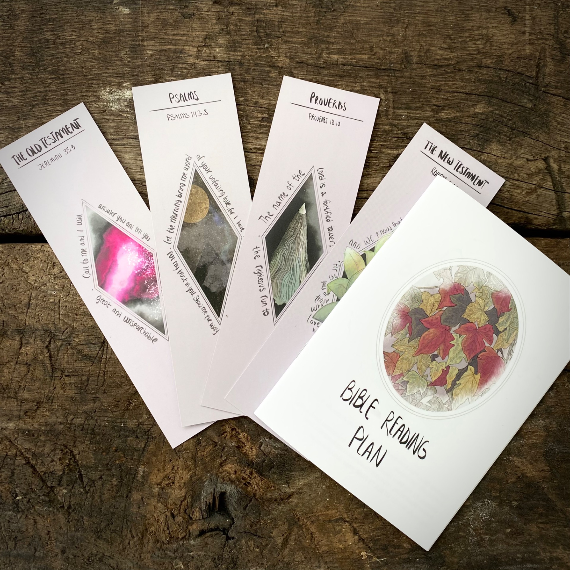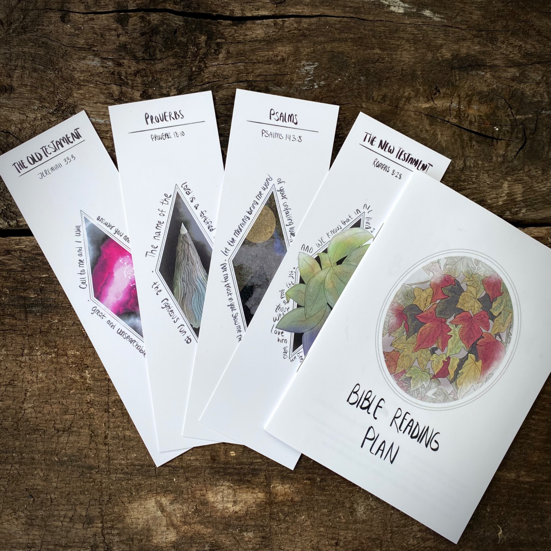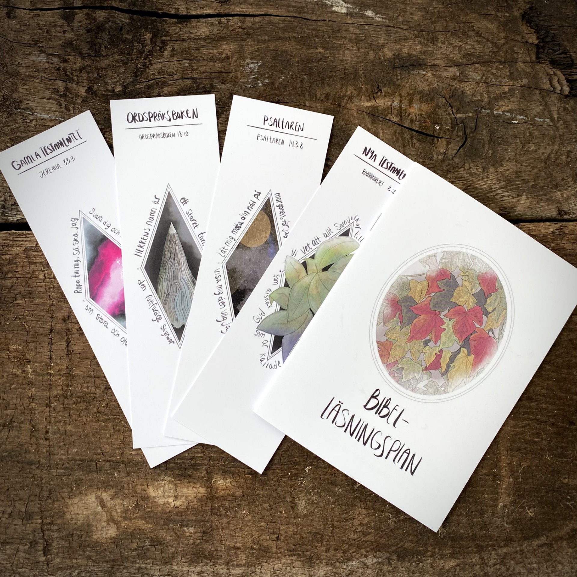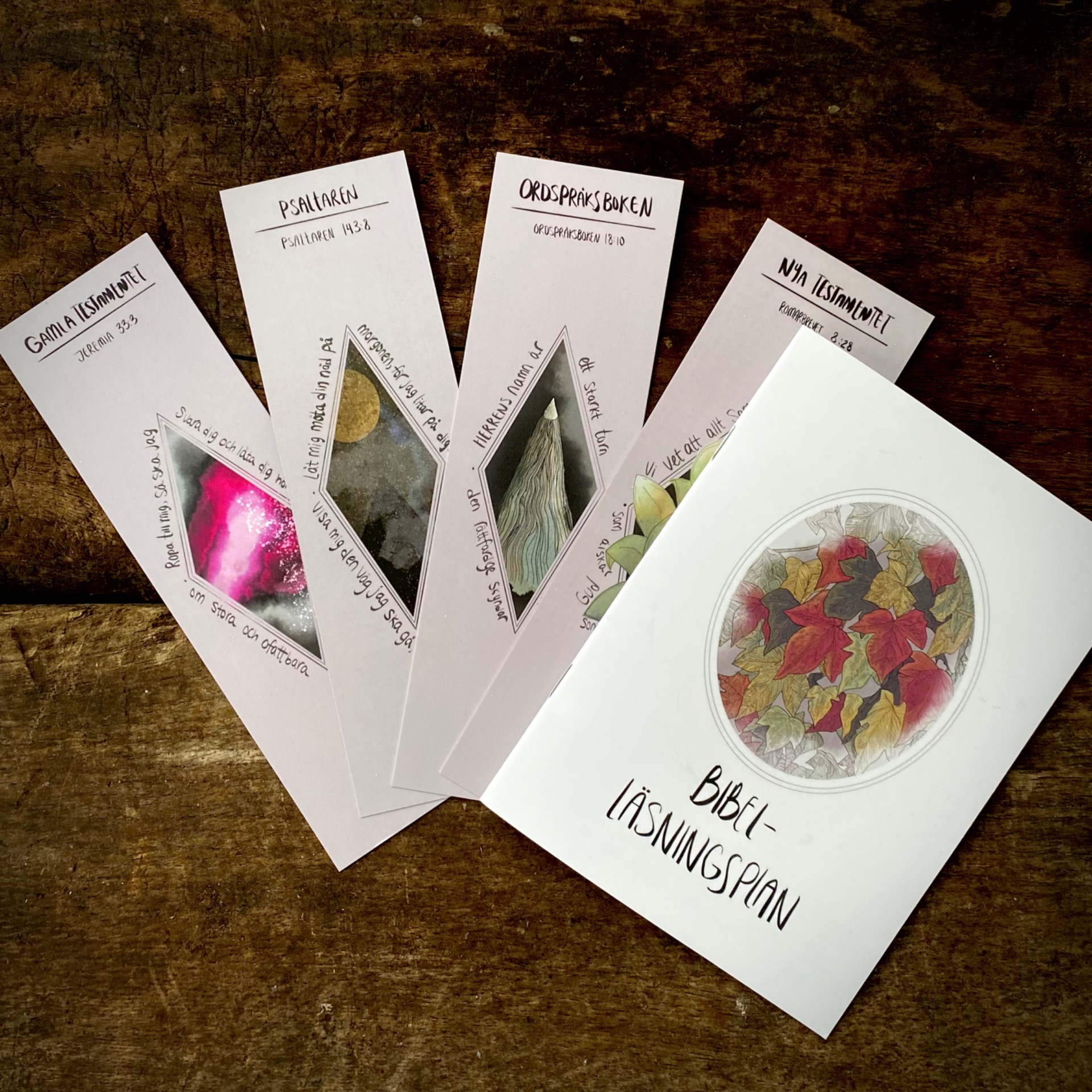 Bibelläsningset med 4 bibelbokmärken och bibelläsningsplan.