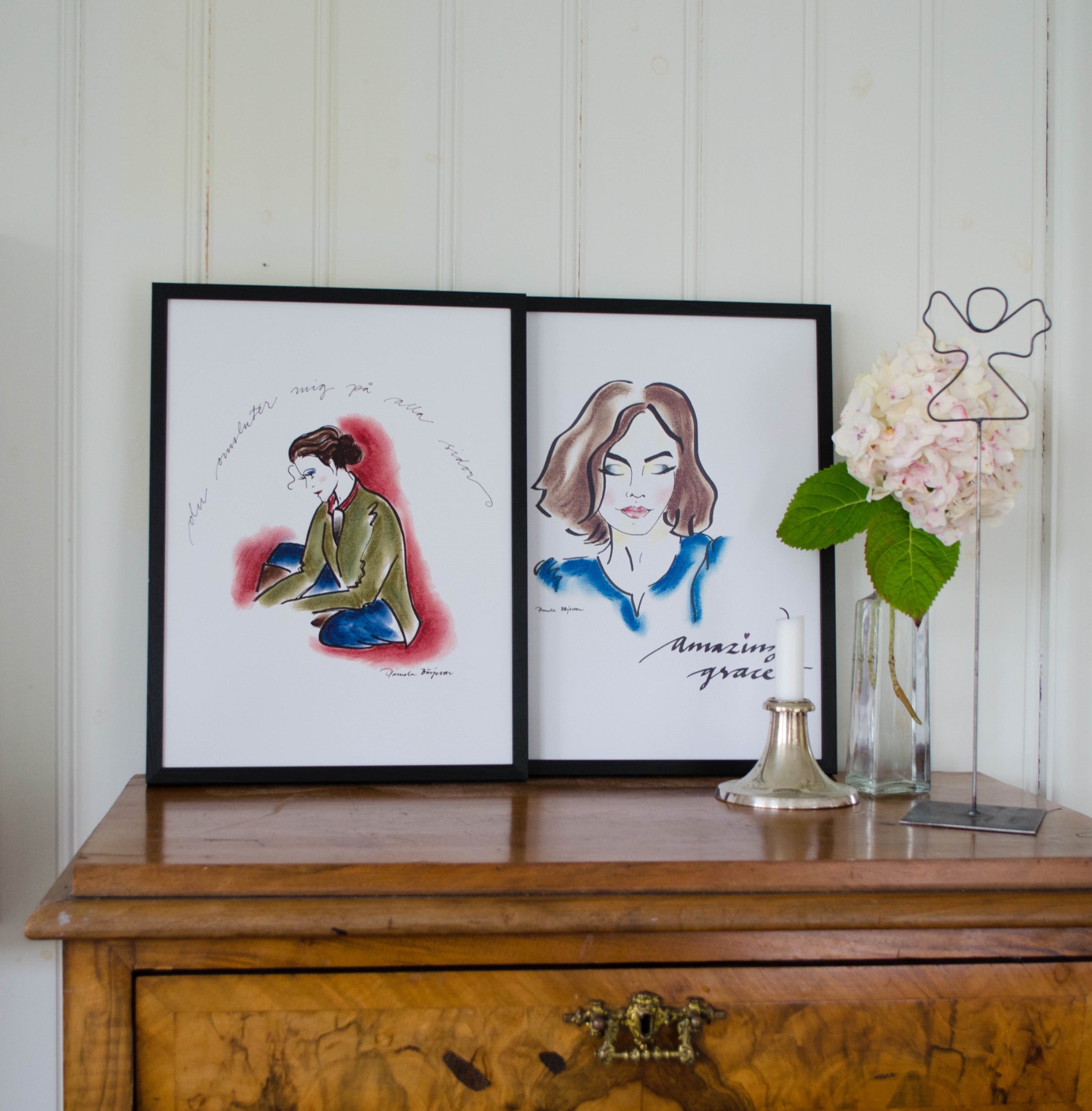 Poster i tusch- och torrpastell av Pamela Börjesson.