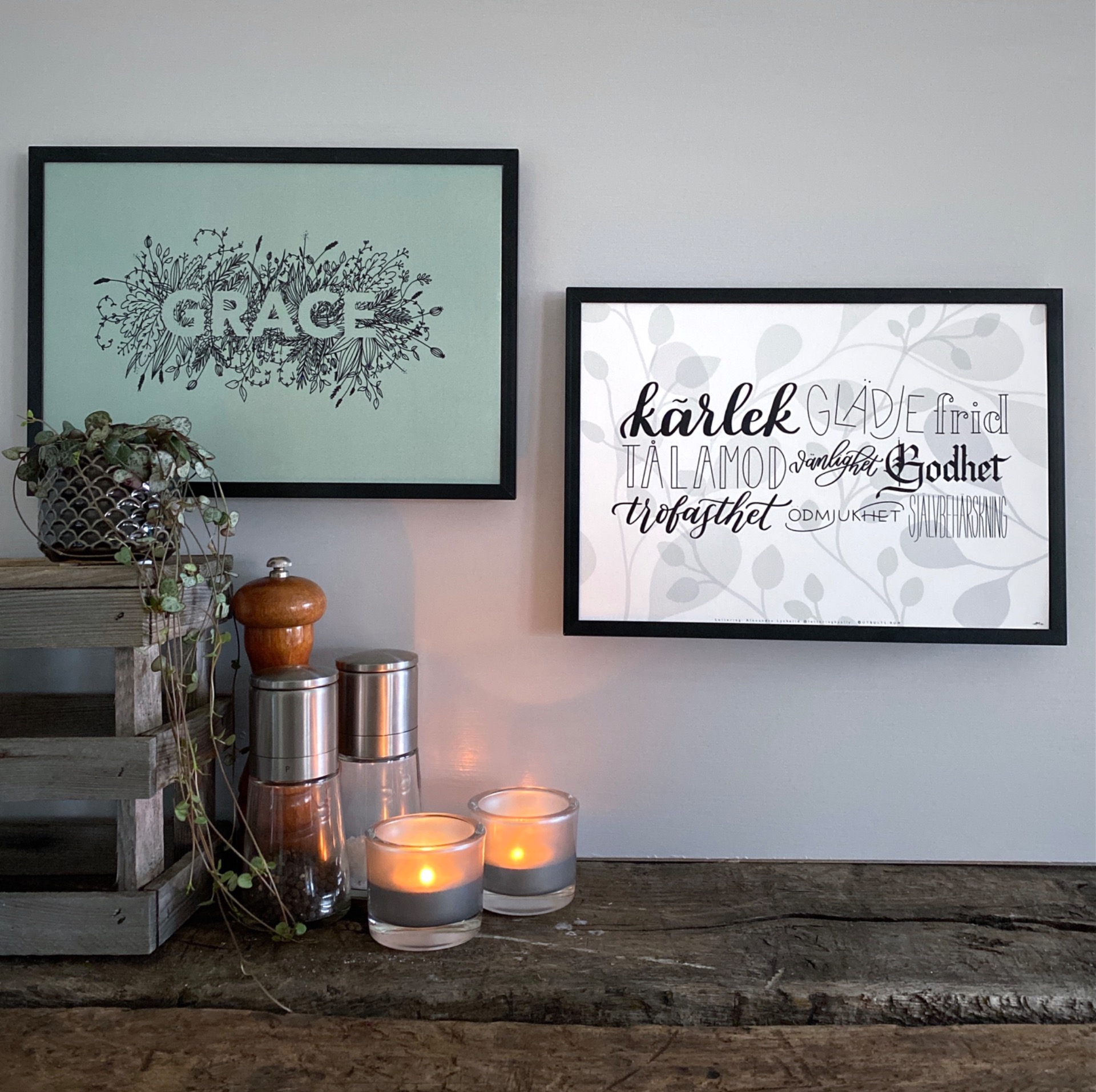 Prints formgiven av Alexandra Lyckelid med texten: kärlek, glädje, frid, tålamod, vänlighet, godhet, trofasthet, ödmjukhet och självbehärskning.Storlek: A4, 21x30 cm